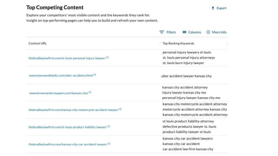 3. Scroll down to Top Competing Content. This is your competitors’ most visible content, and the top keywords that this URL is ranking for.
