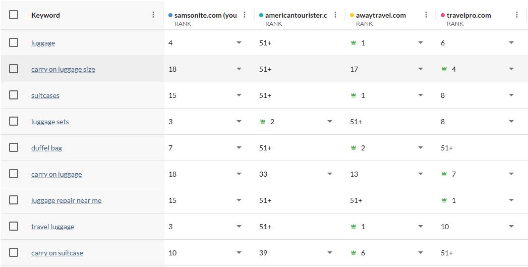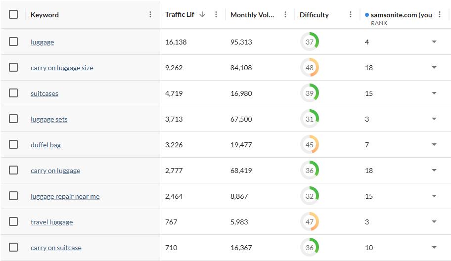 Immediately, you can see something interesting: a focus on carry-on luggage terms, including informational terms like “carry-on luggage size.” This is an actionable topic that’s an important part of the searcher’s journey, and Samsonite could materially benefit from closing this gap and taking Travel Pro’s position.
